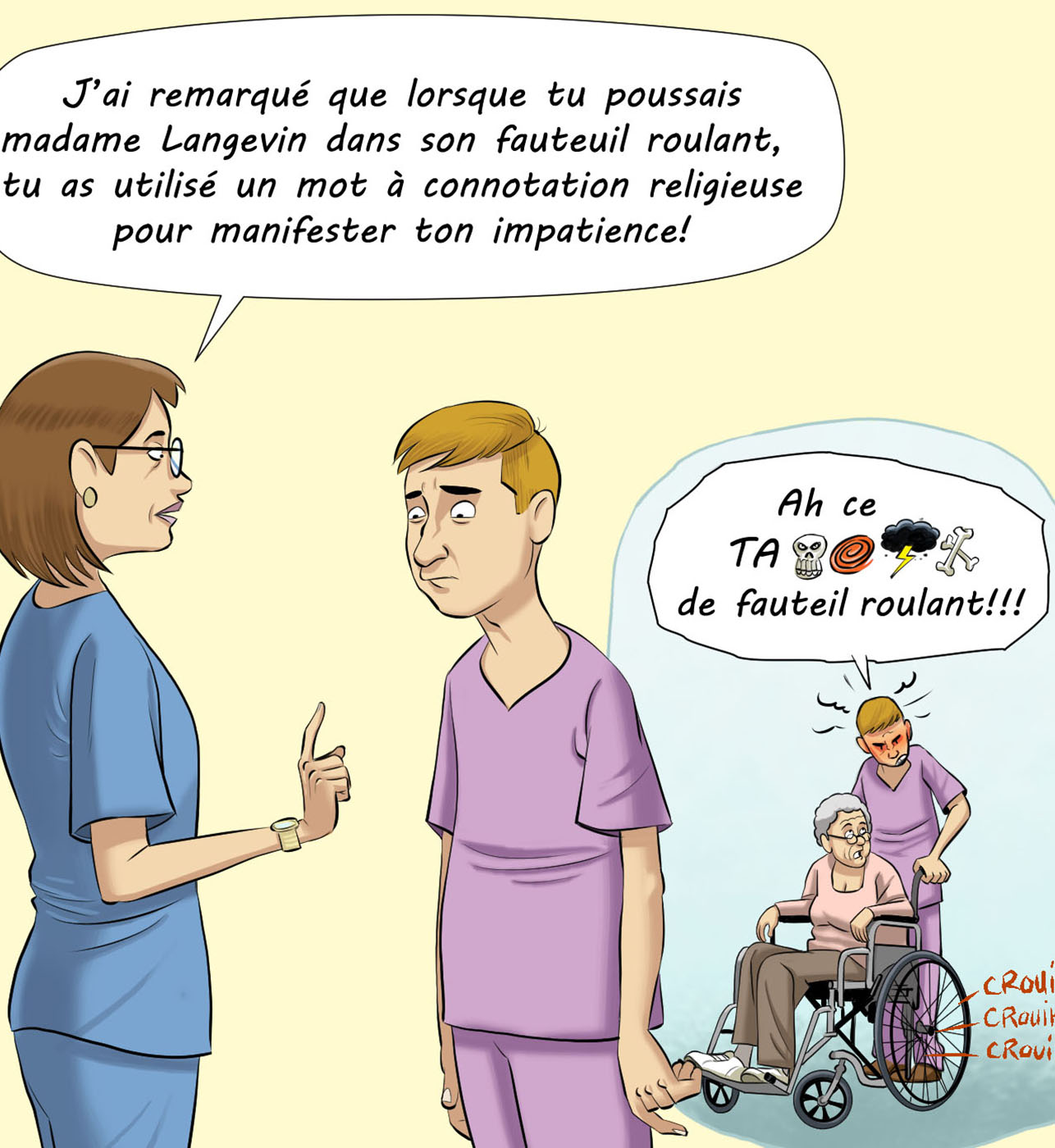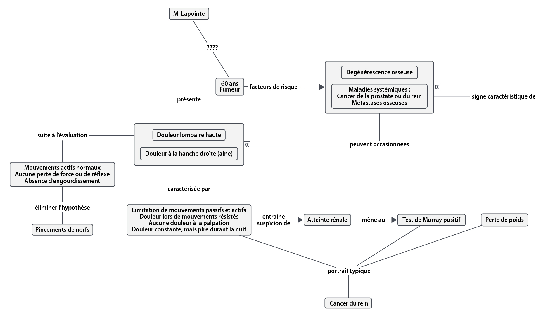 - Douleur augmentée au repos, orienté aux trois sphères, diminution de l’autonomie aux activités de la vie quotidienne, discours tangentiel, habiletés motrices dans la norme, etc.